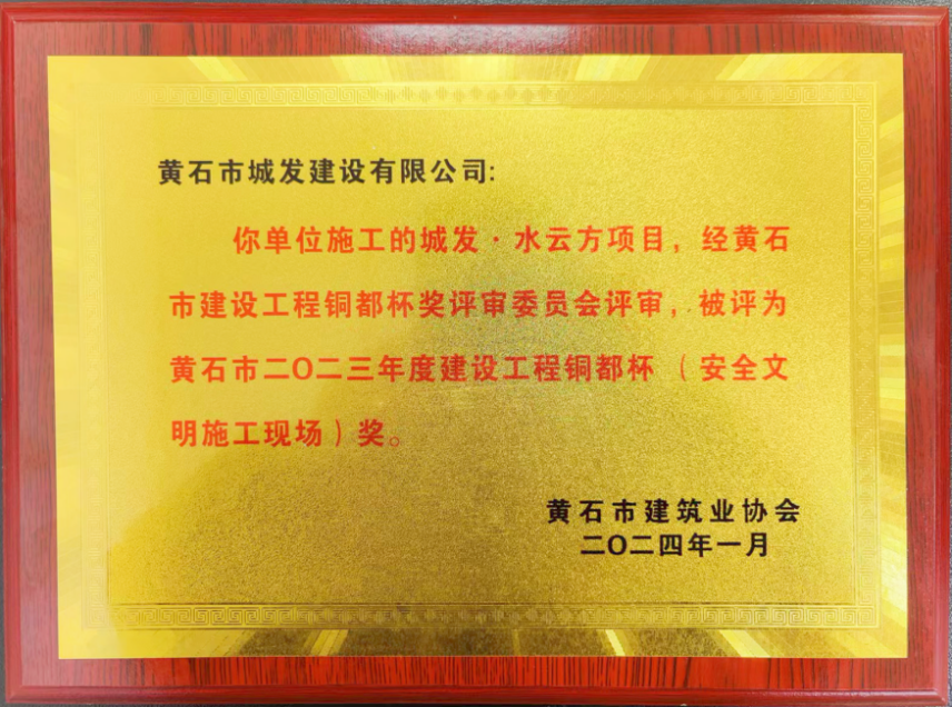 近日,由黃石市城發(fā)建設(shè)有限公司承建的城發(fā)·水云方項(xiàng)目榮獲黃石市2023年度建設(shè)工程安全文明施工現(xiàn)場和結(jié)構(gòu)優(yōu)質(zhì)工程獎。